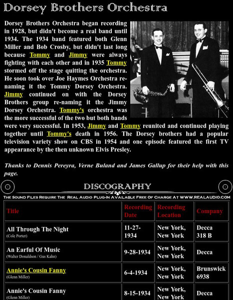 Brief history of the Dorsey Brothers' musical careers including a good sized discography collection.