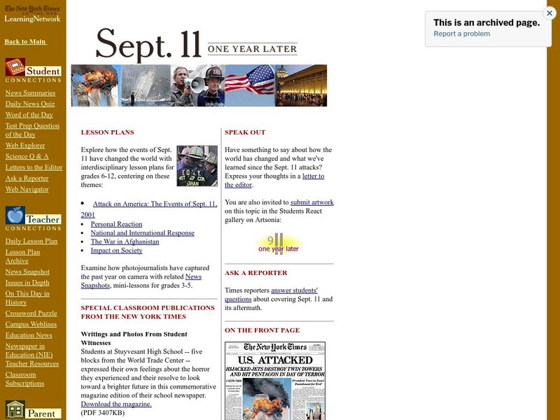 The New York Times Learning Network provides a variety of archived news articles, lesson plans, and resources concerning the issues and events that surfaced from the September 11, 2001 attacks.