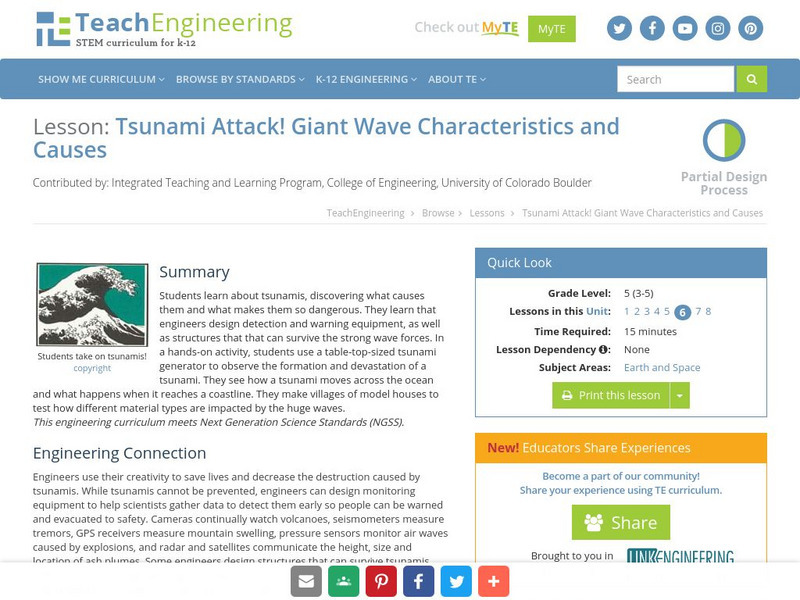 Students learn about tsunamis, discovering what causes them and what makes them so dangerous. They learn that engineers design detection and warning equipment, as well as structures that that can survive the strong wave forces. In a...
