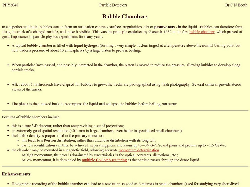 After some brief background information on detectors, this site breaks into information on the cloud chamber, the nuclear emulsion, the bubble chamber, and the multiwire chamber.