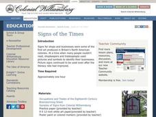 Students pretend to be 18th century shopkeepers or trades people and create signs representing their shops or trades.