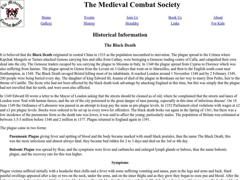 Provides an overview of historical information about the Black death especially as it occurred in England and Europe. Discusses the many social changes that happened due to the plague. There is also a timeline of key events.