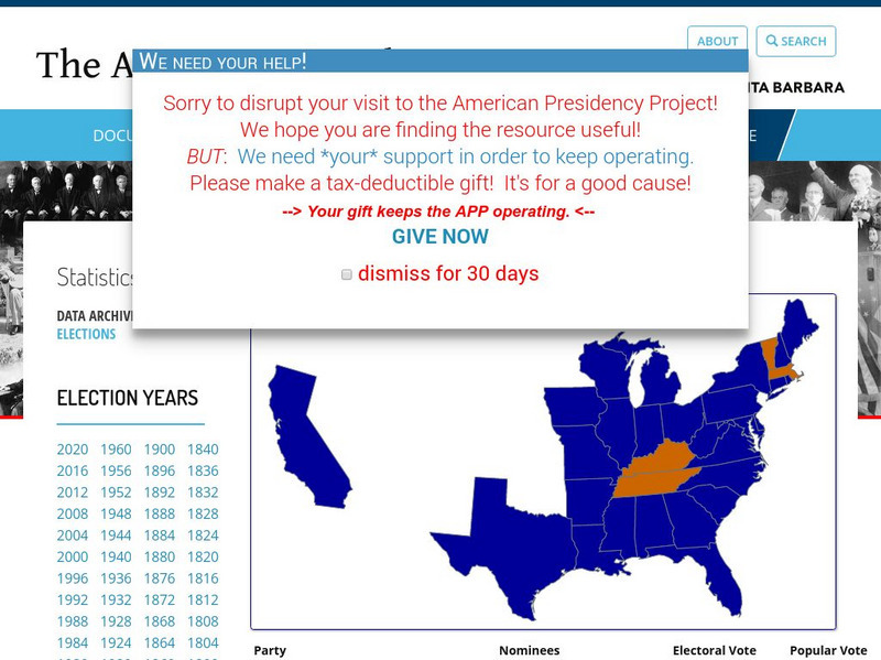 Online resource that provides detailed electoral data for the presidential election of 1852 won by Democratic candidate, Franklin Pierce.