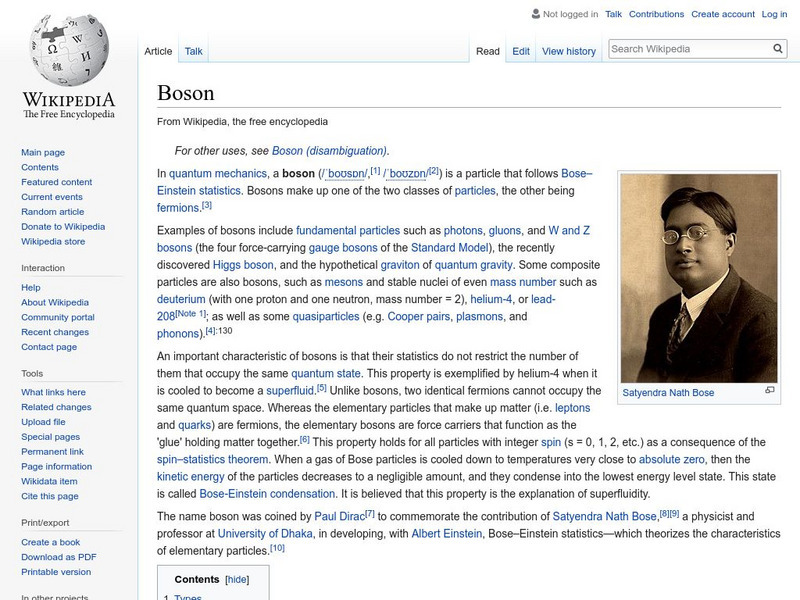 An explanation of what bosons are and how they are different from fermions. Also lists some examples of bosons with links to further information about these.