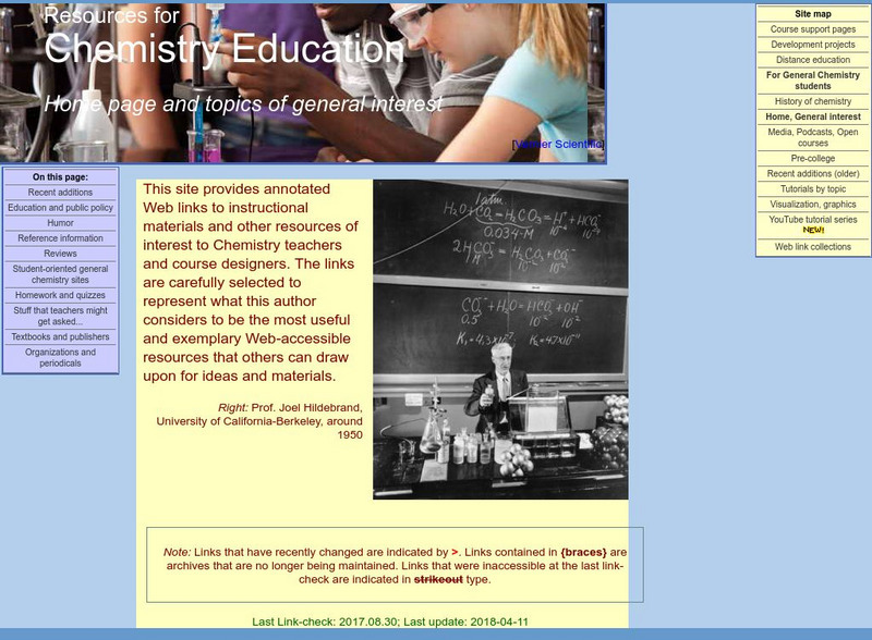 Annotated collection of teacher-reviewed chemistry resources includes the following: current research, public policy, reference information, student-oriented sites, homework and quizzes, questions students ask, and professional...
