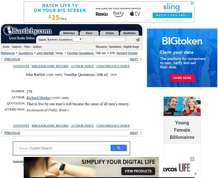This Bartleby.com site offers text of two quotes by Richard Hooker (1874-1937 CE) from his major work, "Ecclesiastical Polity"