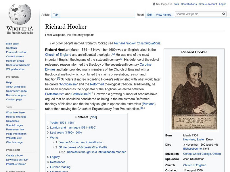 Wikipedia provides brief biographical information on Richard Hooker, English writer and Anglican theologian.