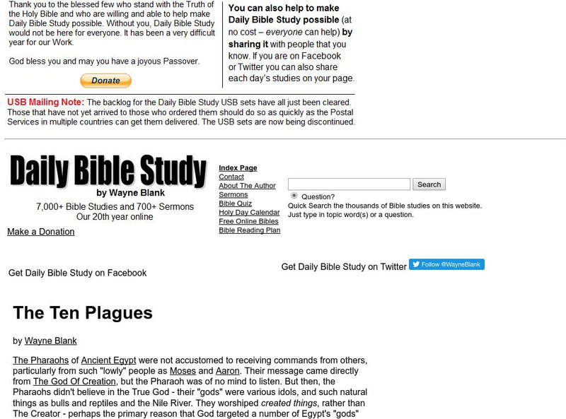 This is an excellent site to help with research on the Ten Plagues in the book of Exodus. It describes the situation in Egypt that the time and gives Biblical references for each plague.
