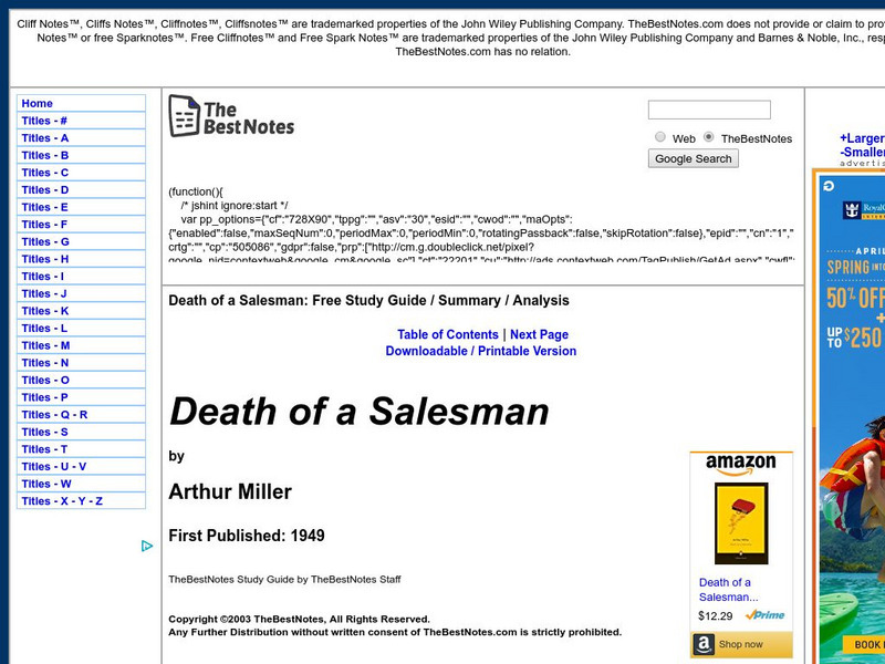 This is an online study guide/notes for the play Death of a Salesman by Arthur Miller including author information, literary elements, act-by-act summaries/notes, study questions, and analysis.