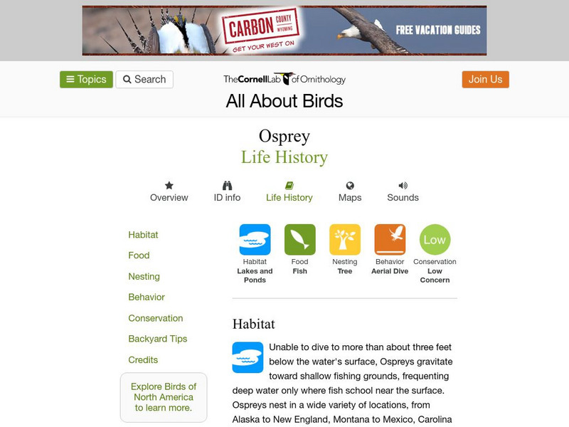 Canadian Wildlife site features the Osprey. Highlights its habitats and habits, range, feeding and breeding characteristics.