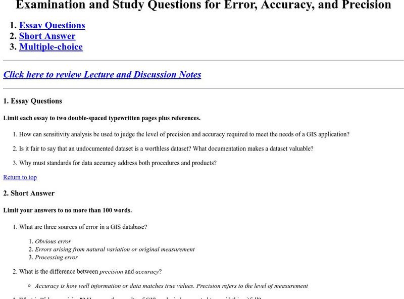 A university exam on the topics of error, accuracy, and precision. Includes essay, short answer, and multiple-choice. Links to lecture and discussion notes. Answers to short essay and multiple-choice are provided.