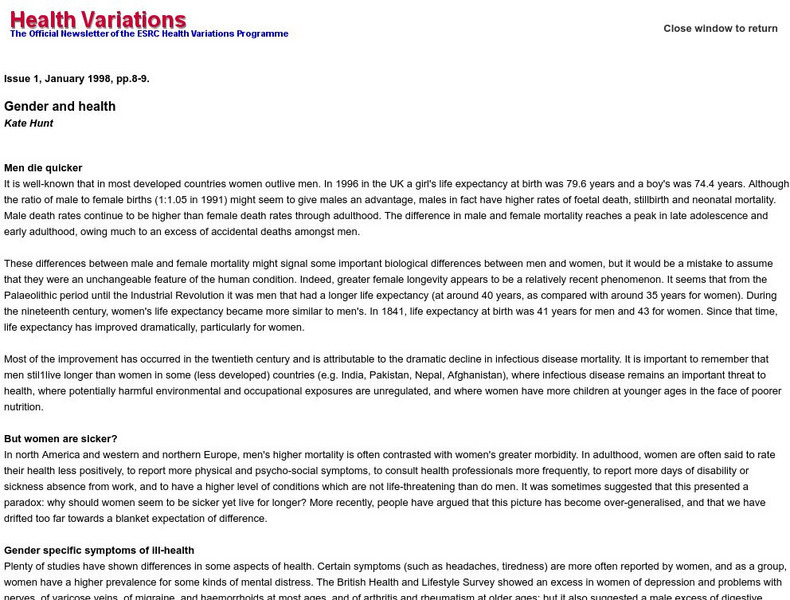 This article explores women's health vs. men's health. Includes discussion of why women's life cycle is typically longer than men's, and why women tend to report poorer health than men.