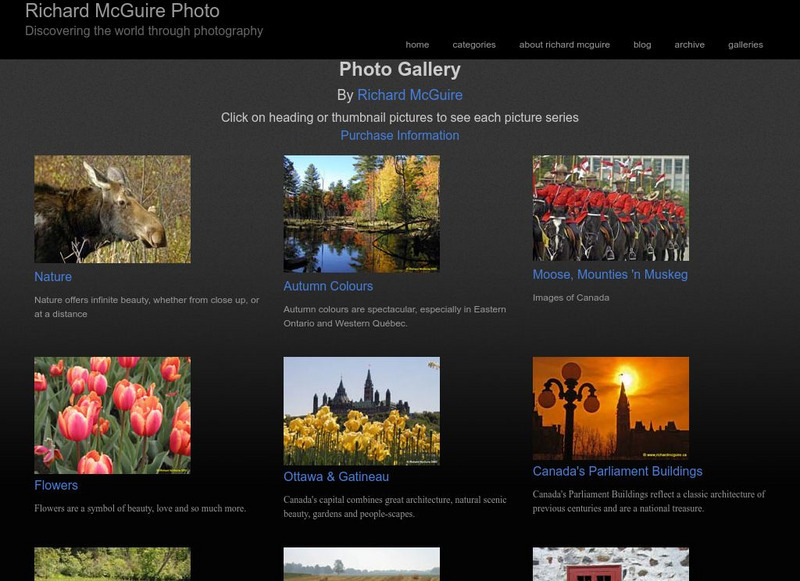 Extensive photo gallery with beautiful images covering a variety of topics such as nature, Parliament, provinces, geography, and cities taken by photogapher Richard McGuire.
