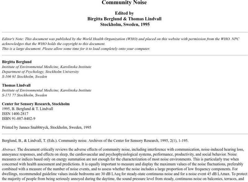 A European study from the World Health Organization on the effects of noise pollution in communities. Definitions, physiology, effects - very comprehensive, well-indexed.