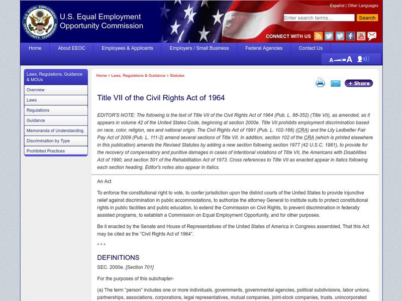 Title VII of the Civil Rights Act of 1964 provided important protection for fairness in employment by establishing the Equal Employment Opportunity Commission. Read the text of that legislation here, and see how it protects workers on...