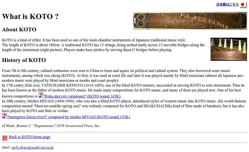 A personal site with a description of the Koto, a large traditional Japanese zither-like instrument. Includes pictures.