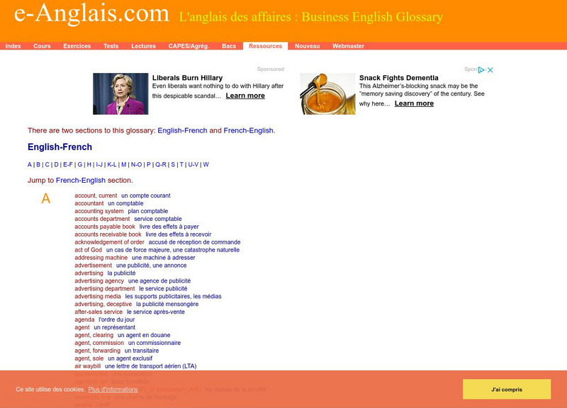 Businsess terminology - English/French or French/English listing of terms relating to business, banking, buying, selling etc. Very easy to use - has some phrases e.g. "cancel an order" = "annuler une commande".