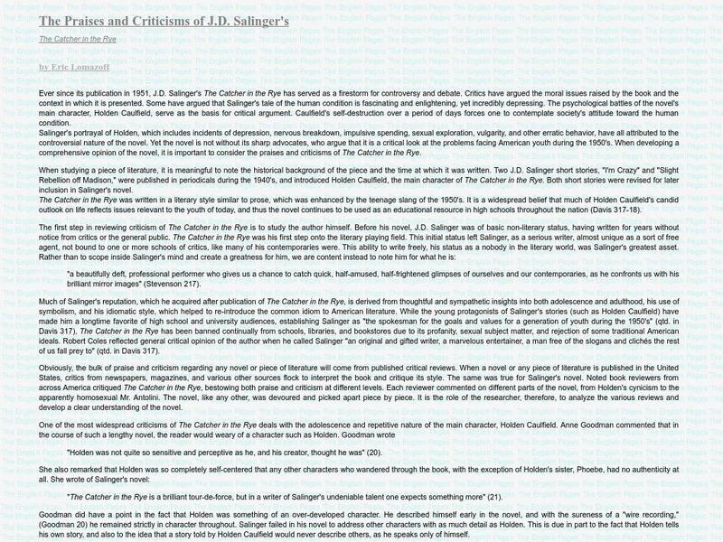 Contains an article written on the praises and criticisms of J.D. Salinger's "The Catcher in the Rye."