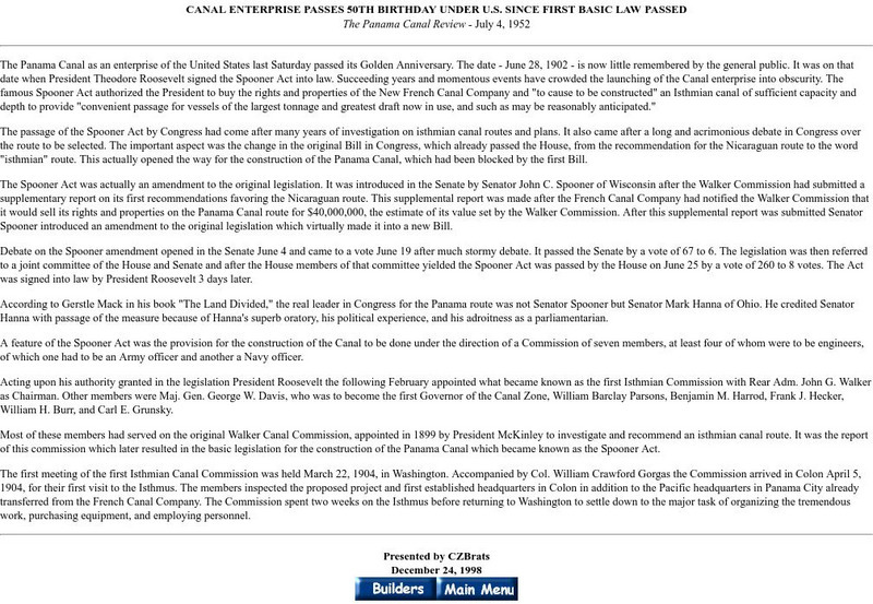 This page is an article entitled "CANAL ENTERPRISE PASSES 50TH BIRTHDAY UNDER U.S. SINCE FIRST BASIC LAW PASSED", taken from The Panama Canal Review, July 4, 1952.