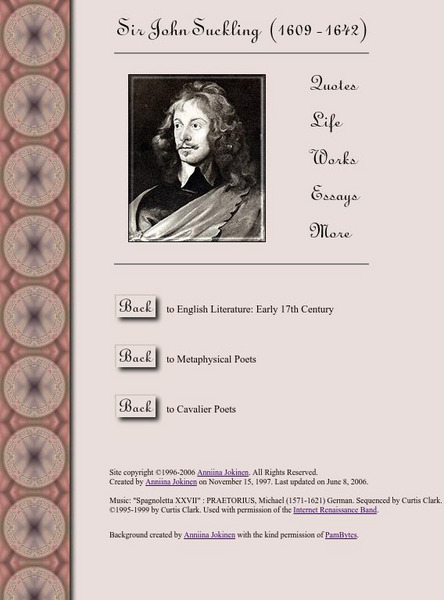 This literary website contains fifteen poems of Sir John Suckling. Also on this site famous quotes, and many essays written by students and scholars about the Cavalier Poets, among others.