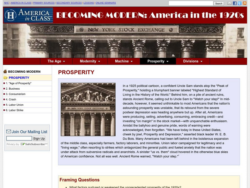 Collection of six sections with primary resource material on the prosperity achieved during the 1920s explores consumerism, labor, and business. Includes notes, discussion questions and links to supplemental sources.