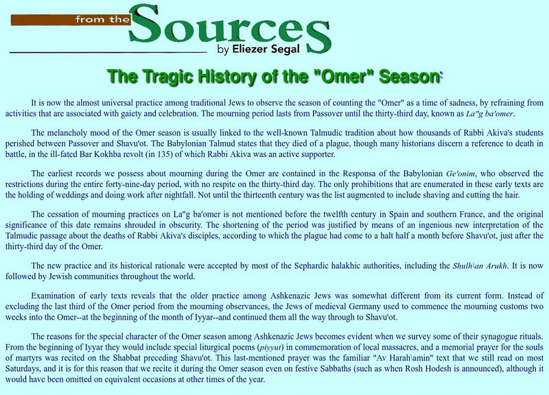 This resource provides information behind the Omer. Also traces the observance of the ritual among Ashkenazic Jews.