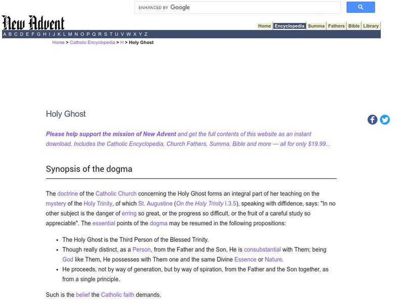 This site from The New Advent takes a detailed look at The Holy Spirit through the Catholic Church. It also looks at the Catholic Dogma on the Holy Spirit. Please note that ?The Catholic Encyclopedia? is a historic reference source and...