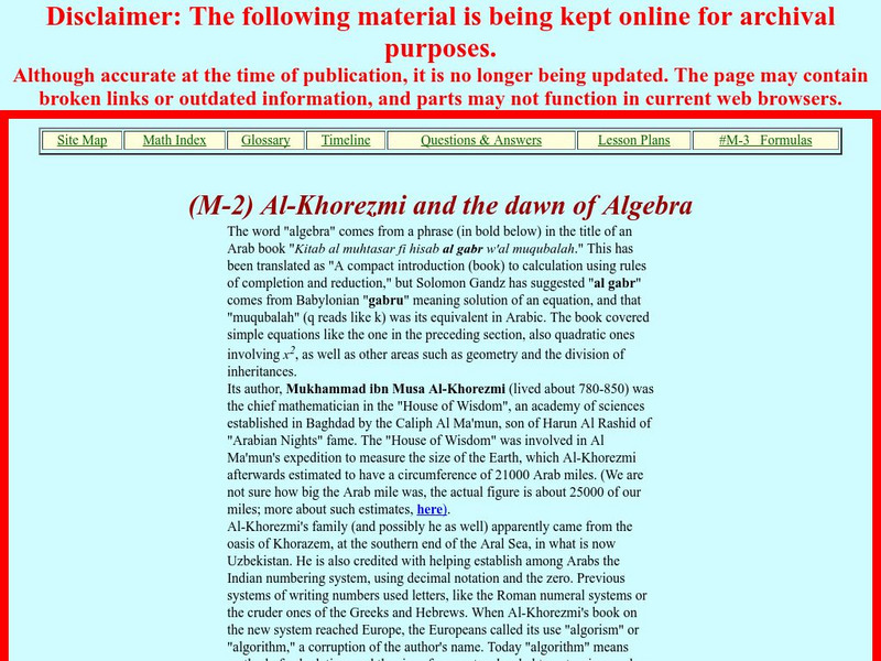 At this site from NASA you can read about Al-Khawarizmi (also known as al-Kwarismi or al-Khorezmi) and his significant role in the early study of algebra.