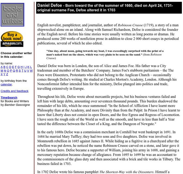 This site gives a thorough biography of Defoe. It includes quotes from his writing and information about his most important works.