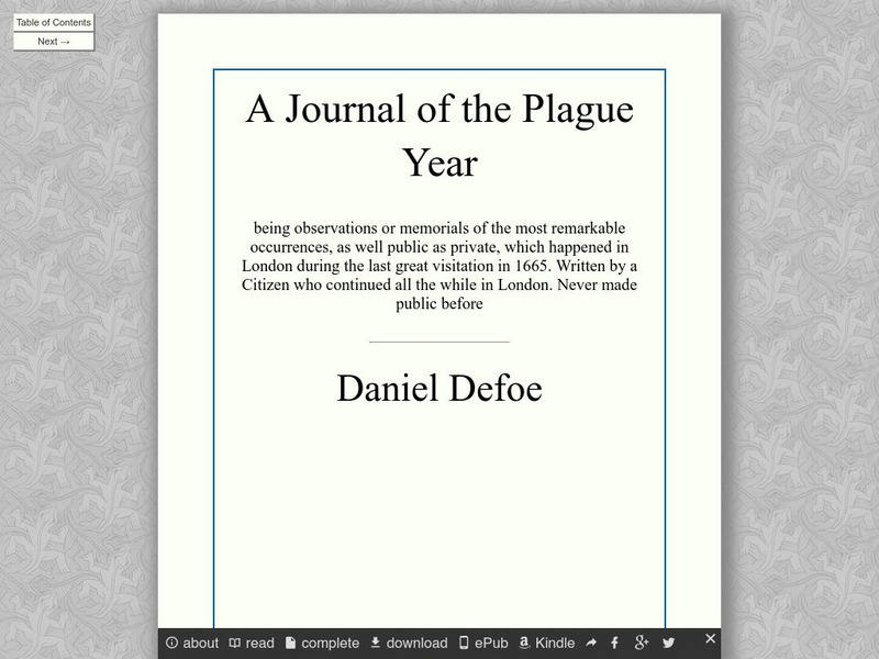 This site from the University of Adelaide provides the etext of a "Journal of the Plague Year," by Daniel Defoe. It traces the occurrences of 1665 in London through the eyes of the famous novelist, Daniel Defoe.