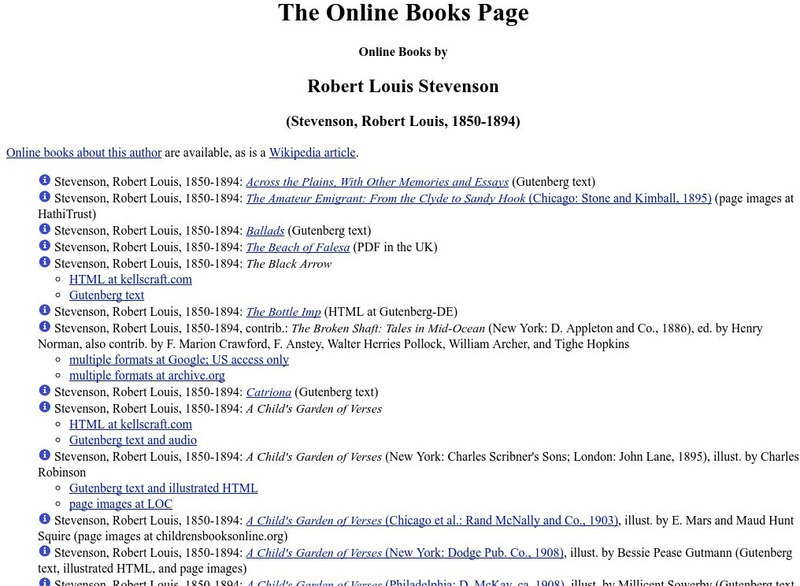 The Digital Library provides links to the complete texts for 47 works done by Robert Louis Stevenson!