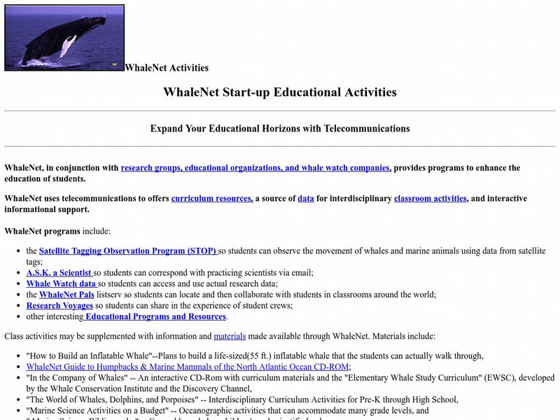 Site provides resources for teachers seeking to construct an interdisciplinary unit on whales. Includes links to "Whale Watch Data," News Archives, and much more. Provides various activities teachers can integrate into their classrooms...
