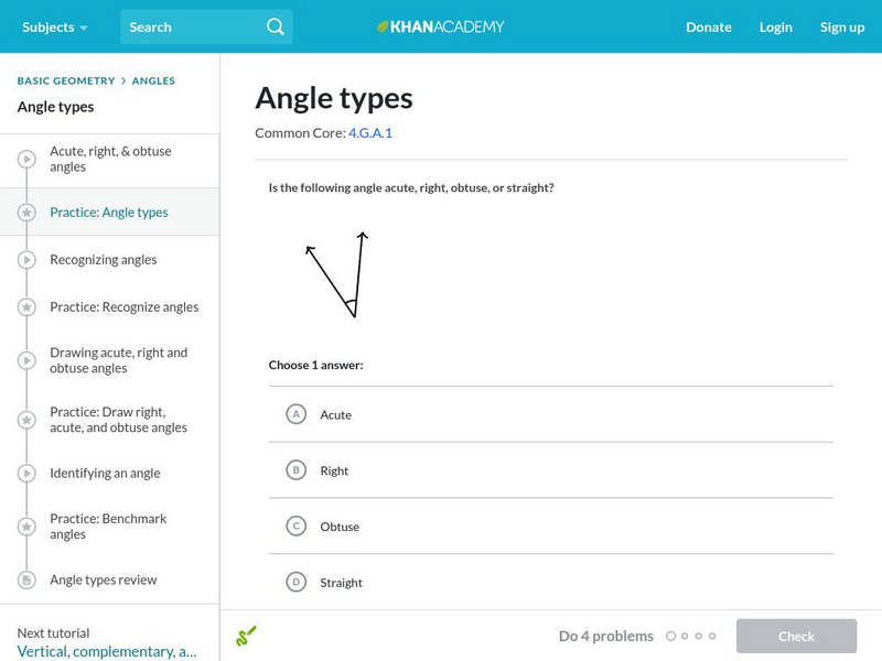 Determine if an angle is acute, right, or obtuse. A protractor is provided. Students receive immediate feedback and have the opportunity to try questions repeatedly, watch a video or receive hints.