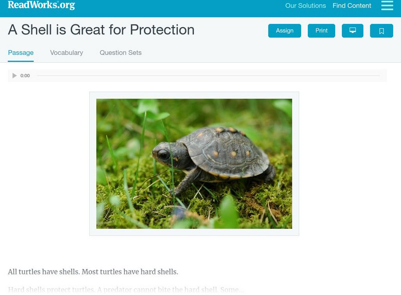 [Free Registration/Login Required] This nonfiction passage shares information about the topic of shells. This passage is a stand-alone curricular piece that reinforces essential reading skills and strategies and establishes scaffolding...