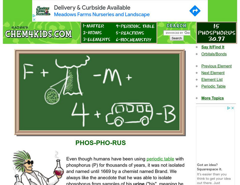 Here you can find some great information about the 15th element in the periodic table, "phosphorus." Content focuses on phosphorus' electrons, where you can find phosphorus in nature and in the home, and how phosphorus combines with...