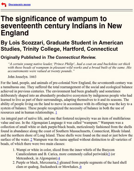 This site contains information about the term Wampum and its significance. Also contains information about Native Americans collecting shells and their worth to the tribe.