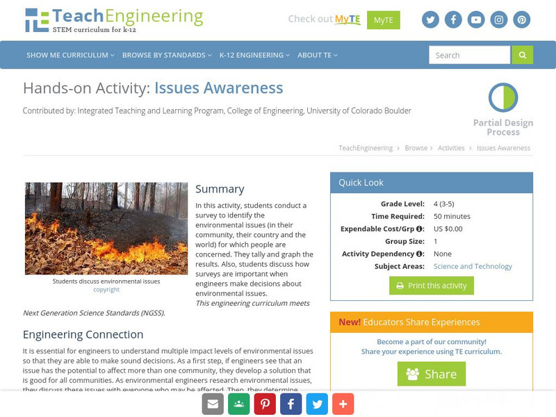 In this activity, students will conduct a survey to identify the environmental issues (in their community, their country and the world) for which people are concerned. They will tally and graph the results. Also, students will discuss...