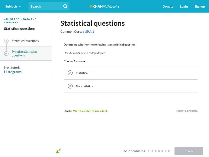 Practice spotting the difference between statistical and non-statistical questions. Students receive immediate feedback and have the opportunity to try questions repeatedly, watch a video or receive hints.