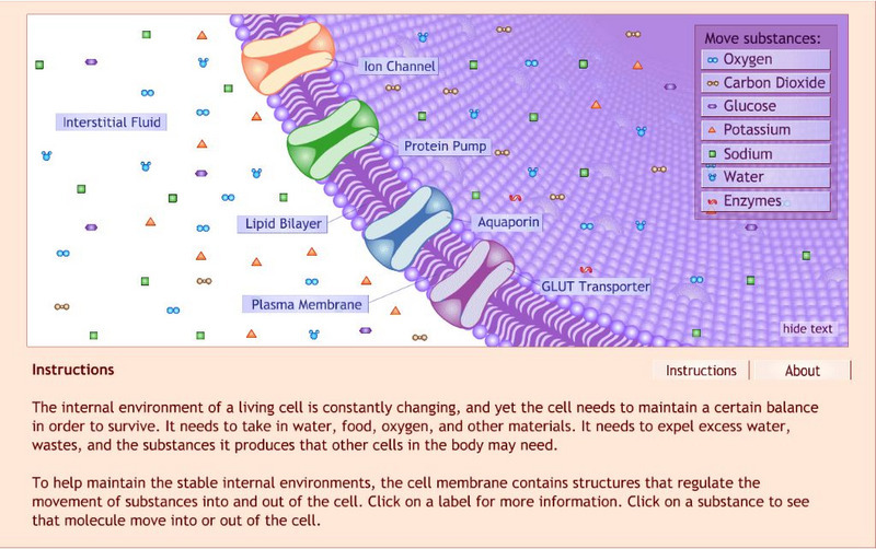This interactive feature illustrates the movement of some materials that pass through the membrane of a cell, and it describes the structures that make it possible.