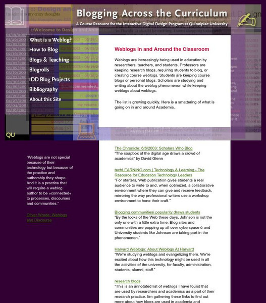 This online course was created for the Interactive Digital Design Department at Quinnipiac University and is designed to examine how weblogs are being used in academia. The various pages cover the basics of weblogs, how to use Blogger...