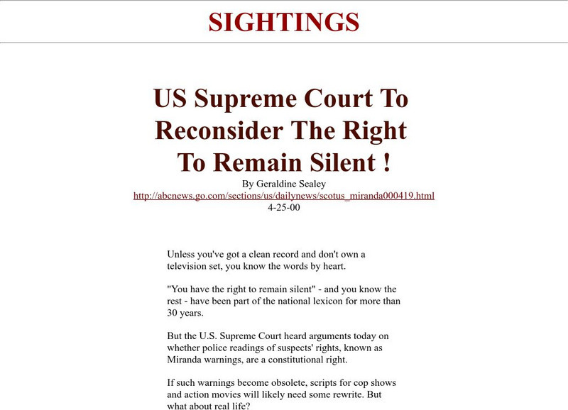 Excerpts from New York Times coverage of the Court arguments in the Dickerson case which revisited the rights established by the Miranda case in 1966.