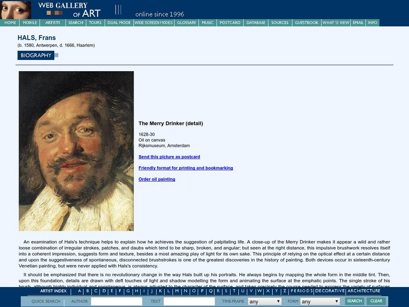 Web Museum gives you biographical information about Frans Hals. There are also links to three of his paintings but not "The Merry Drinker".