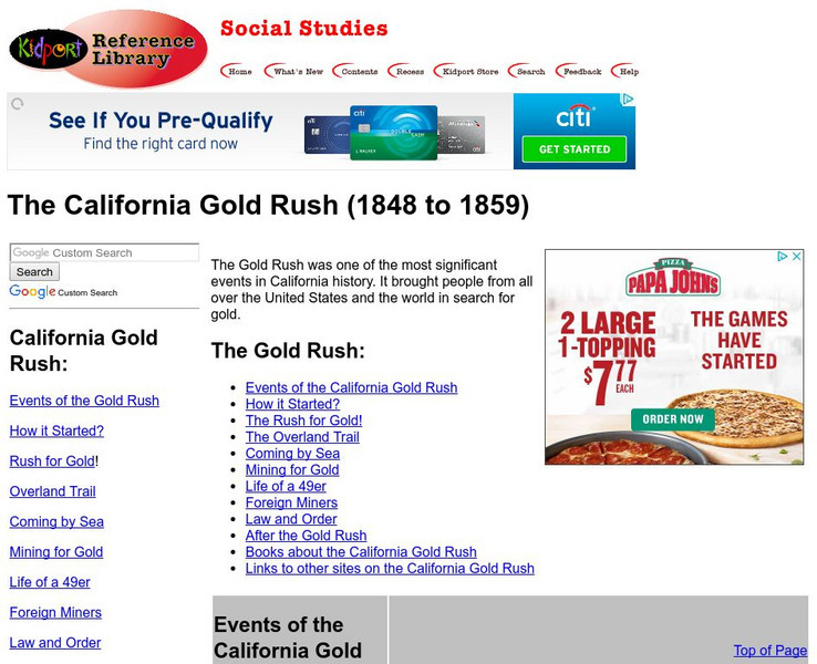A rich site on the California gold rush, 1848-1858. An online exhibit traces the gold rush using primary sources, a teacher page gives lesson plans from 4-12 and a kid's page offers further online adventures. Takes a long time to load.
