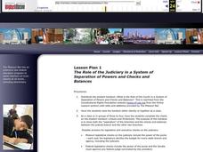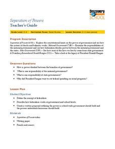 Students examine the roles of each of the branches of U.S. government. In this checks and balances lesson, students watch Discovery video segments and discuss the concept of federalism as they create a school-wide policy for government...