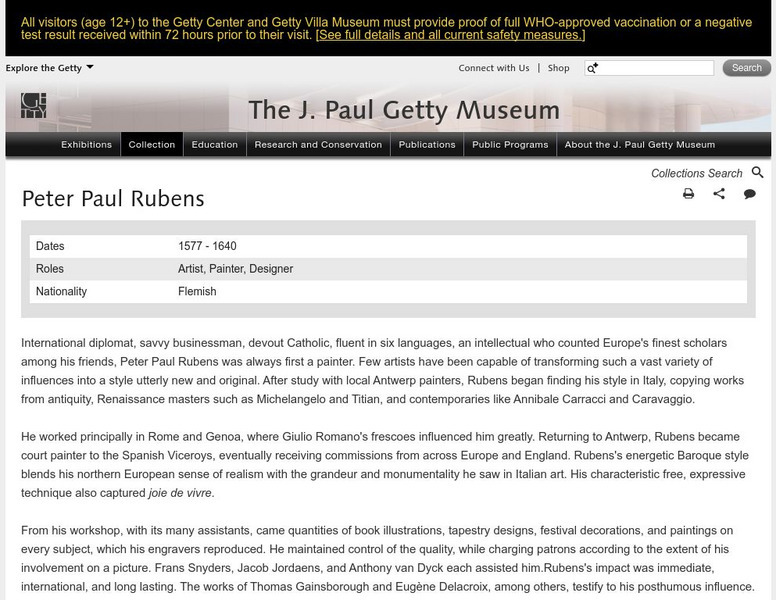 This site, which is provided for by the WebMuseum Paris, provides a brief but factual biography of Peter Paul Rubens with links to Rubens's contemporaries and work. Also you can link to a page that describes the Baroque Style.