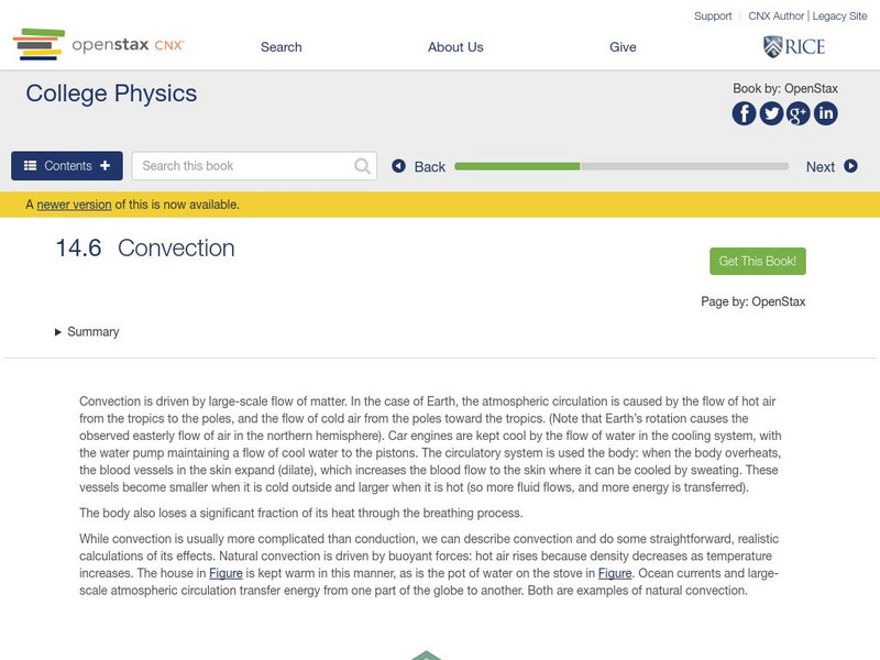 In this section of a college textbook, the topic of convection is explored. Understand how the process of convection transfers heat. Also learn how to calculate the rate of heat transfer by convection. Section also includes problems and...