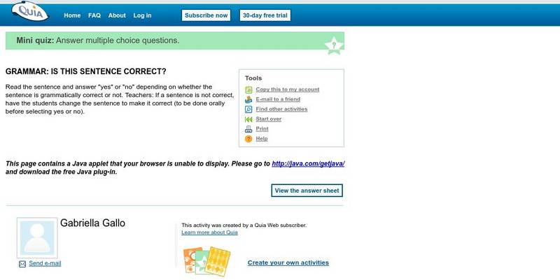 This site offers a 30 question, interactive sentence quiz. Students are asked to read sentences, decide if they are correct as written, and then select a response. Java is required.