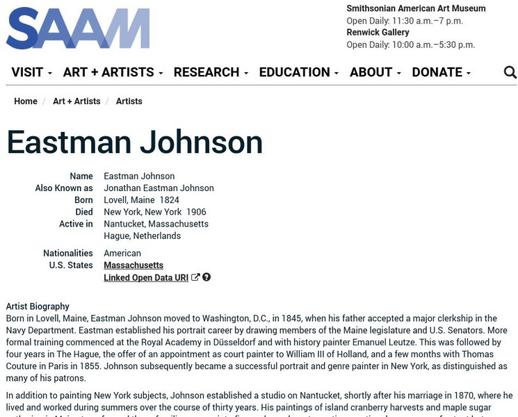 As part of the Smithsonian Art Museum's database of artists, Eastman Johnson is described here along with information on his contributions to art through his portrait paintings.