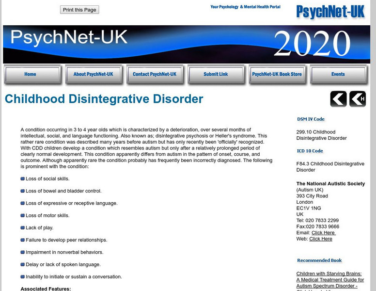 This information sheet provides a summary of Childhood Disintegrative Disorder, including symptoms, history, and treatment directions.
