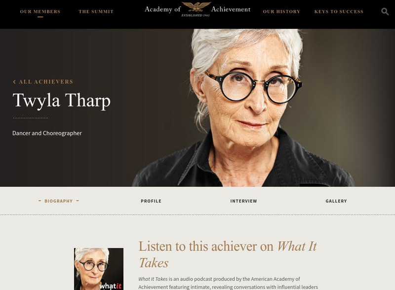 A biography of renowned dancer and choreographer Twyla Tharp. Includes a profile, videos, and a photo gallery.